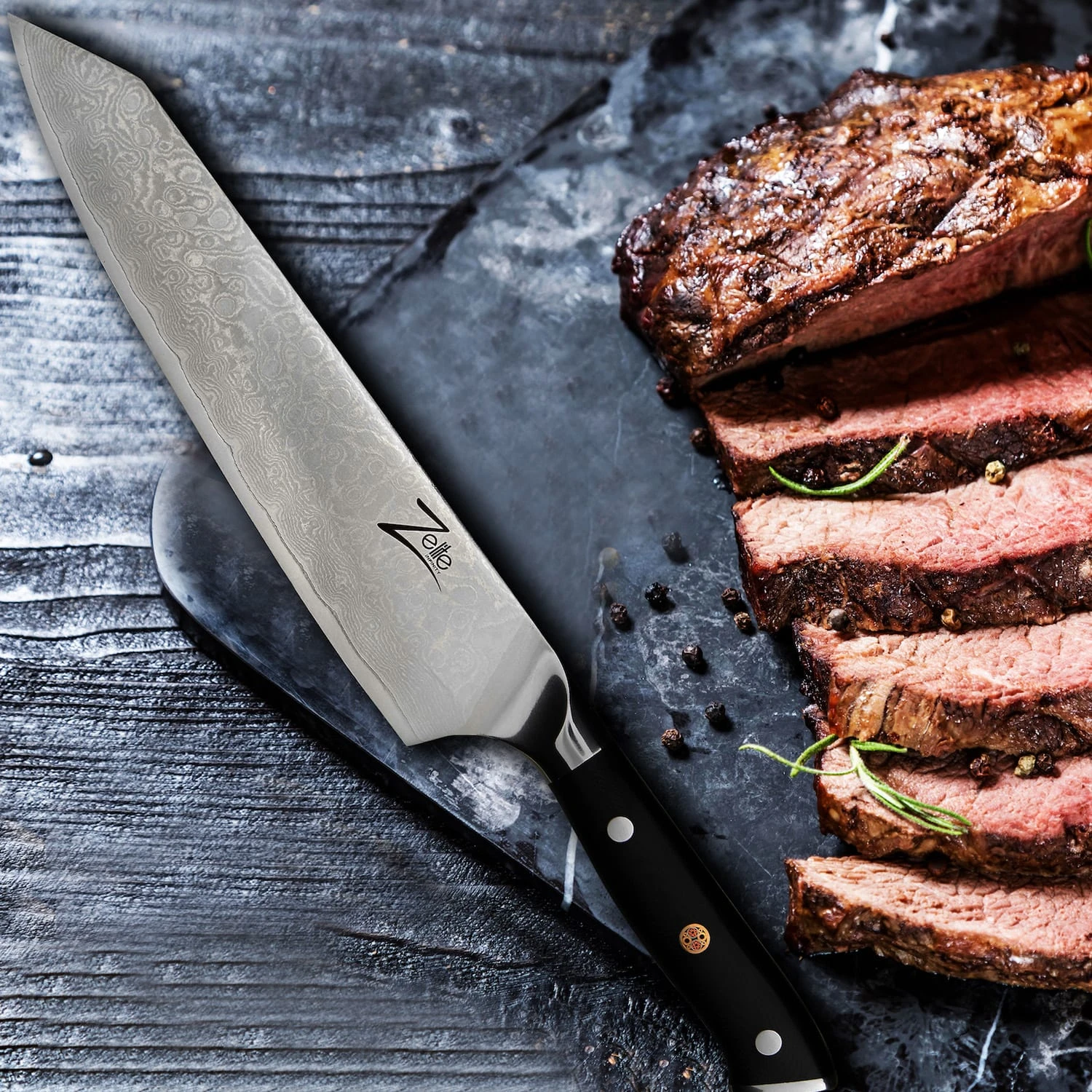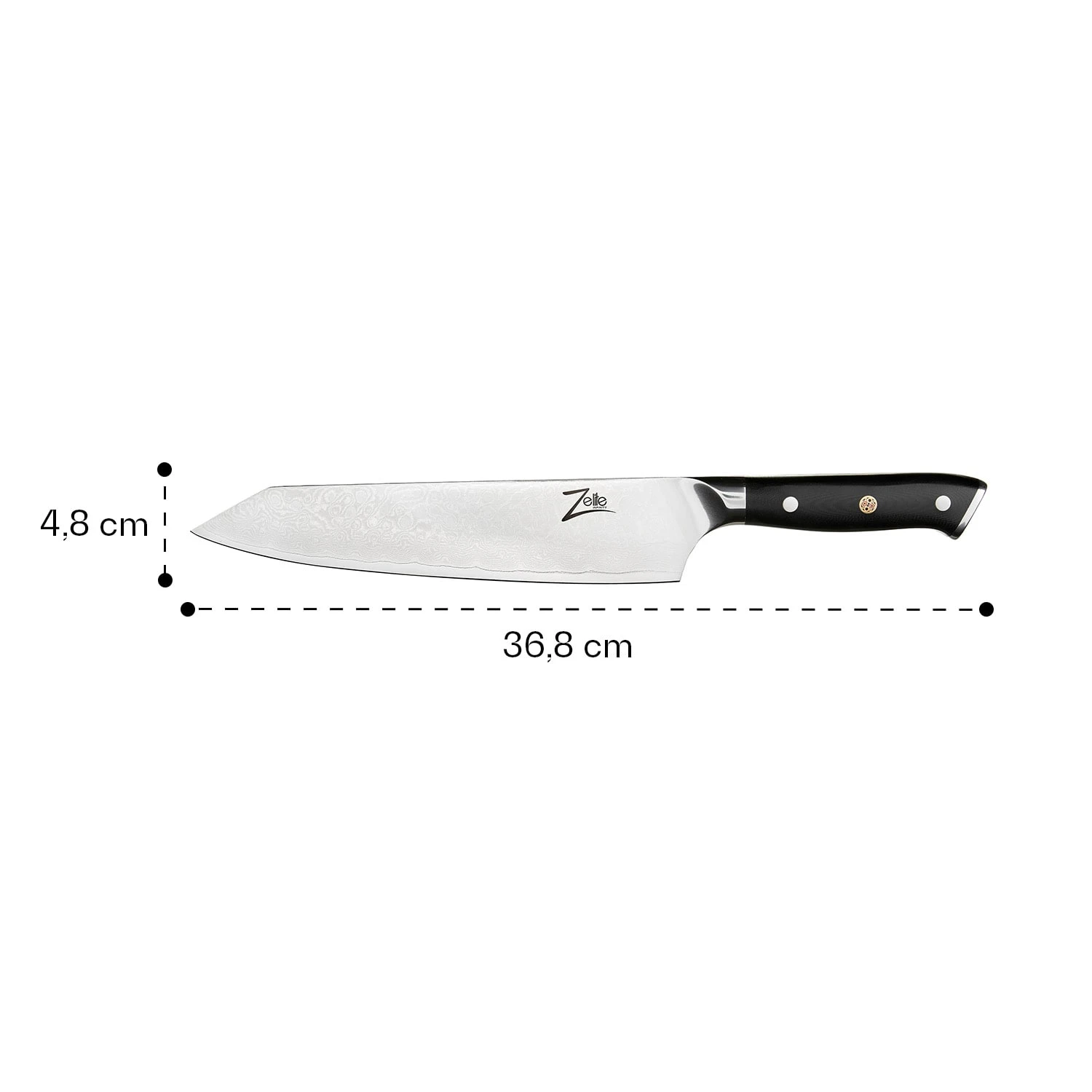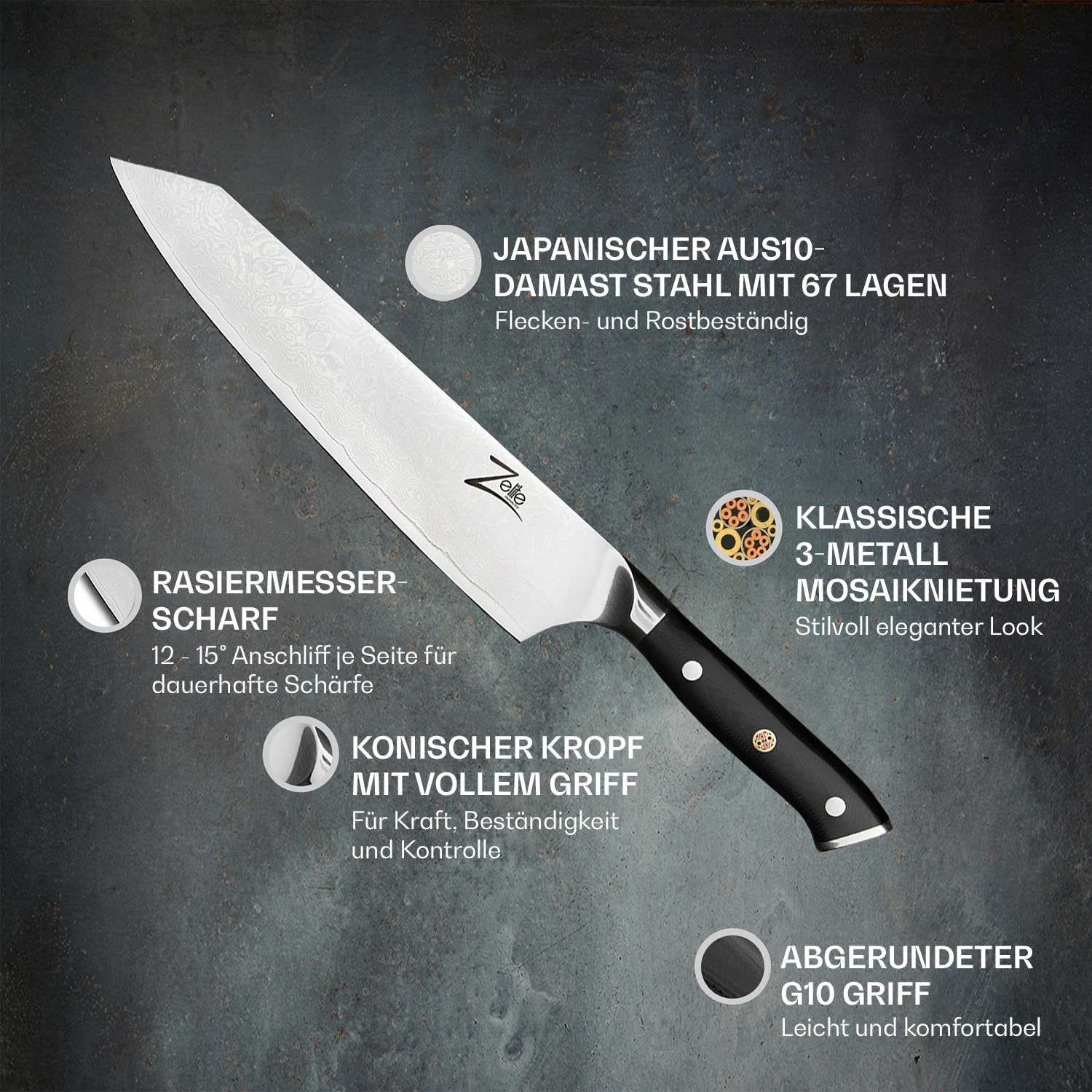 Exklusive Präzisionsmesser nach japanischem Vorbild: Die handgeschliffene Zelite Infinity by Klarstein Alpha-Royal Japanese Messerserie erfüllt hohe Ansprüche bei jeder Kochkunst. Insgesamt 67 Schichten bilden als hochwertiger, japanischer Damaszener-Stahl übereinanderliegend die changierende Klinge. Durch eine perfekt ausbalancierte und ergonomische Formgebung und einen nahtlosen, dreifach vernieteten Griff aus G10-Glasfaser liegen die eleganten Küchenwerkzeuge wunderbar in der Hand. Hier verbinden sich Schärfe, Haltbarkeit, Gewicht, Kontrolle und Handhabung mit außergewöhnlichem Design, perfektioniert durch eine kunstvolle 3-Metall-Mosaikniete im Griff.