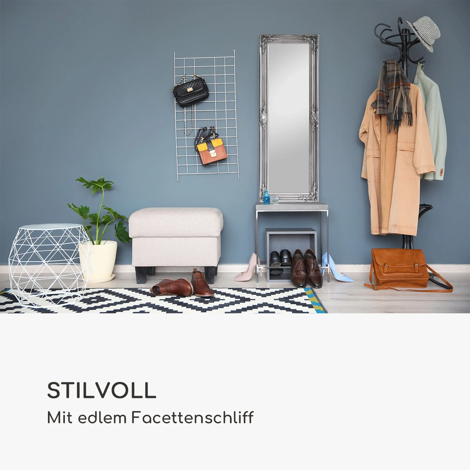 Durch einen Massivholzrahmen mit Gipsapplikationen verleiht der Ashford Standspiegel von Casa Chic by blumfeldt jedem deiner Räume einen besonderen visuellen Akzent. Mit seinem abnehmbaren Standfuß macht der Ashford nicht nur als Aufsteller, sondern auch aufgehängt jederzeit eine gute Figur. Der Spiegel mit Facettenschliff und Abmessungen von 130 x 45 cm ist besonders gut zur Verwendung im Hoch- oder im Querformat in Wohnzimmer, Badezimmer, Schlafzimmer oder auch im Flur geeignet.