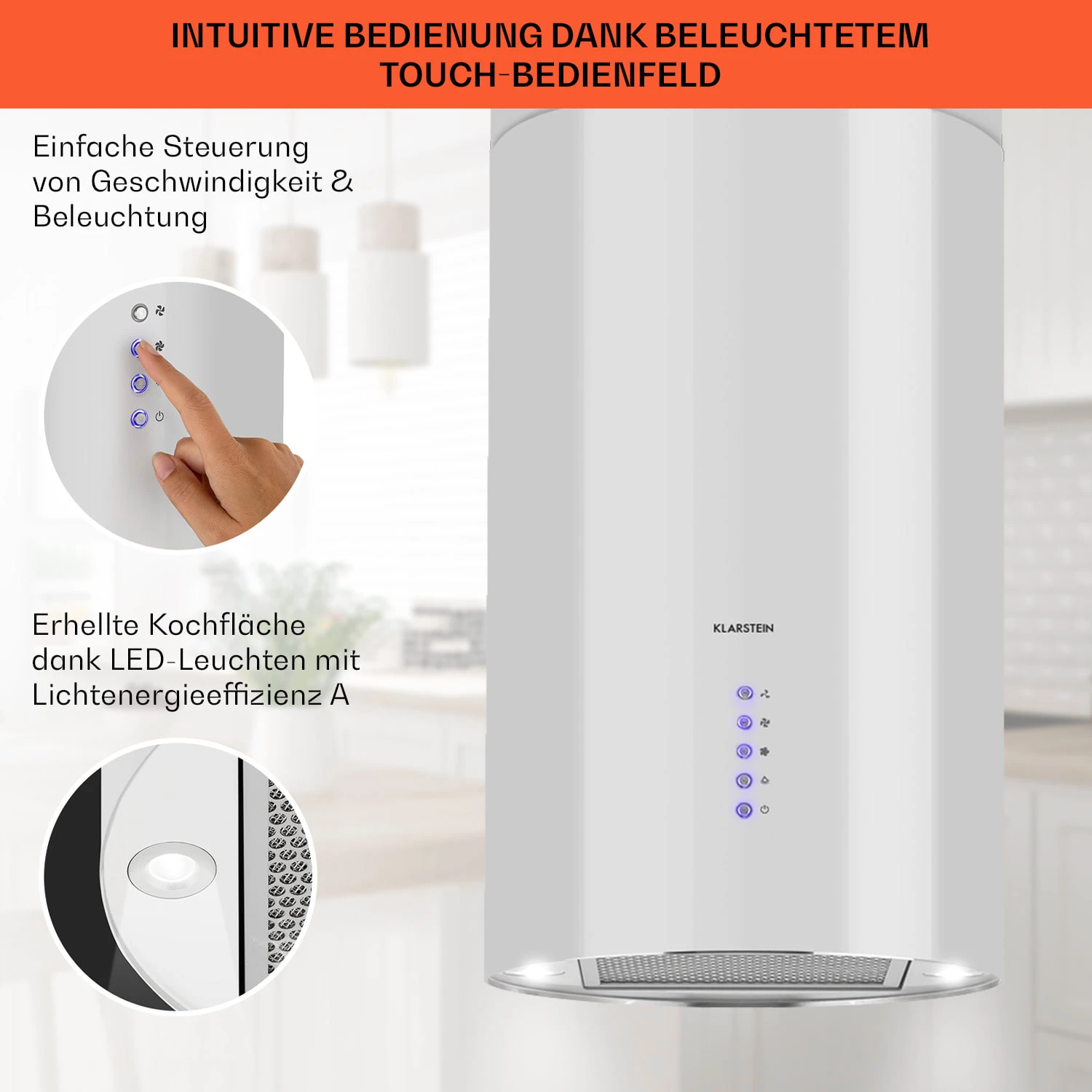 Absolut edel ist auch das äußere Erscheinungsbild der Klarstein Beretta Inselabzugshaube. Das runde, weiße Edelstahlgehäuse verleiht Ihrer Kochinsel umstandslos stilvollen Glanz.