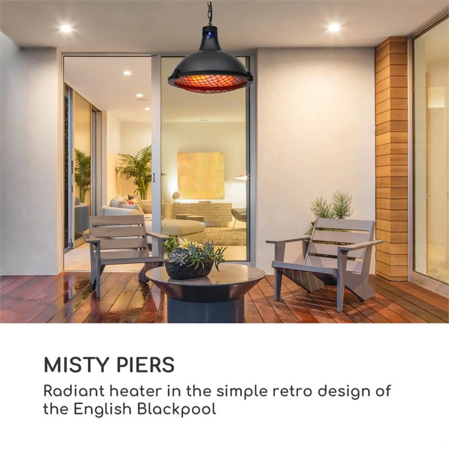 Wenn die Temperaturen fallen, schaltest du einfach entspannt den blumfeldt Blackpool Heat Deckenheizstrahler per Fernbedienung ein, wählst die gewünschte Heizstufe und hauchst so jeder Party neue Wärme ein oder kannst bis spät in die Nacht gemütlich im Freien dinieren. Das hochwertige, ursprüngliche Design mit Metallkörper im Retro-Look vermittelt dabei zusätzlich das Gefühl an den Piers von Blackpool zu entspannen und den kühl-nebligen, englischen Herbsttagen zu trotzen.
