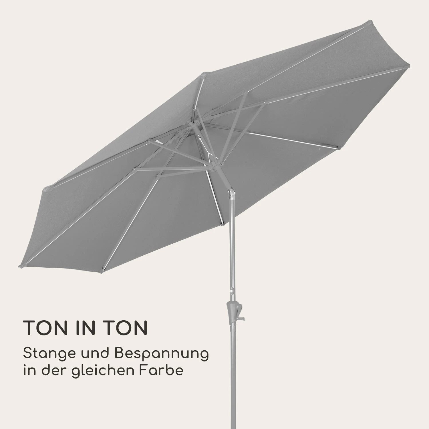 Der Calais Sonnenschirm von blumfeldt schützt tagsüber ideal vor Sonneneinstrahlung und verbreitet abends ein wunderbar gemütliches Licht. Seine integrierte LED-Beleuchtung arbeitet mit einem Solar-Panel, das sich im Laufe des Tages auflädt. So bist du unabhängig von einer zusätzlichen Stromquelle. Unter seinem großen Schirm, der sich sehr flexibel ausrichten lässt, finden Liegestühle, Tische oder Sitzgelegenheiten ein schattiges Plätzchen. Aufbau, Aufspannung und Ausrichtung sind beim Calais ein echtes Kinderspiel. Zum Entfalten der schattenspendenden Bespannung drehst du ganz bequem die mechanische Kurbel und via Druckknopf passt du den Neigungswinkel an.
