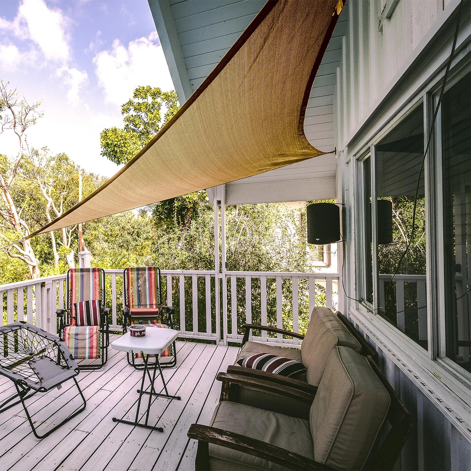 Dank der rostfreien Ringe aus Edelstahl ist die Befestigung sehr unkompliziert. Ziehe einfach die Seile durch die Befestigungsringe, welche du in der Umgebung beliebig anbindest. Für eine dauerhafte Anbringung empfehlen wir dir, anstelle der Seile, Spann- oder Karabinerhaken zu verwenden. Dank des reißfesten und strapazierfähigen Polyester-Materials kannst du das Sonnensegel sehr straff und glatt aufspannen. Zudem ist das Material sehr luftdurchlässig, was dafür sorgt, dass sich unter dem Dach keine Hitze staut. Das Segel hält den Regen ab und ist zudem sehr belastbar, durch festes Material, hochwertige Verarbeitung und doppelte Nähte.