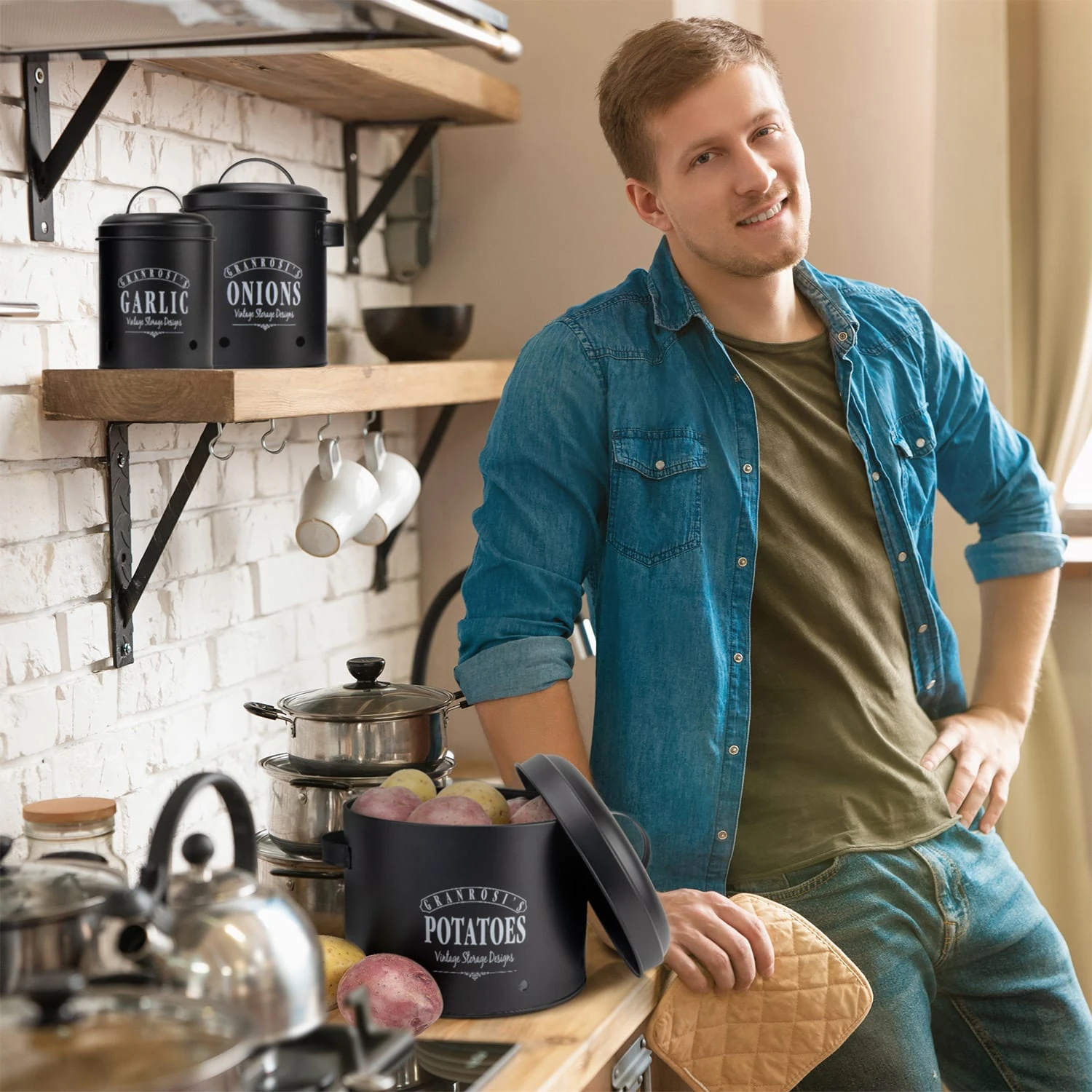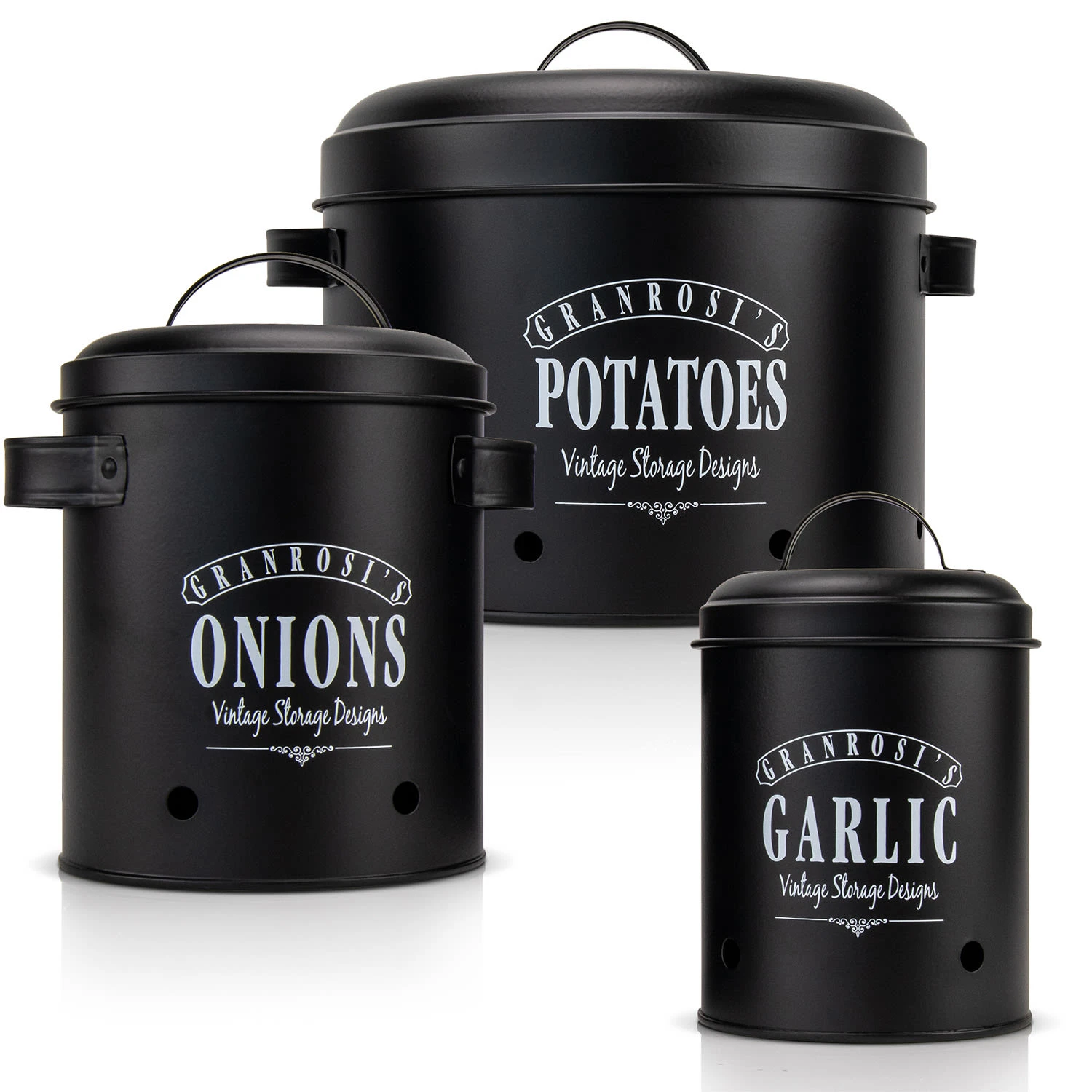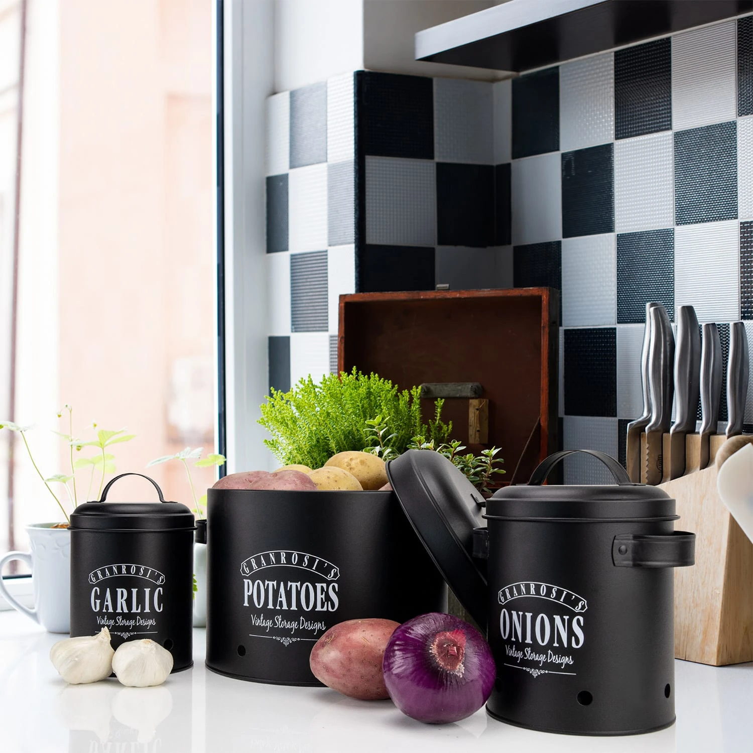 Die Georgia Vintage-Vorratsbehälter verleihen deiner Küche das gewisse Etwas und sind eine Bereicherung für jeden Haushalt: Bestehend aus insgesamt 3 x Klarstein Vorratsdosen für Knoblauch (12 x 18 cm (ØxH)), Zwiebeln (17 x 22,5 x 14 cm (BxHxT)) und Kartoffeln (27 x 21 x 23,5 cm (BxHxT)).