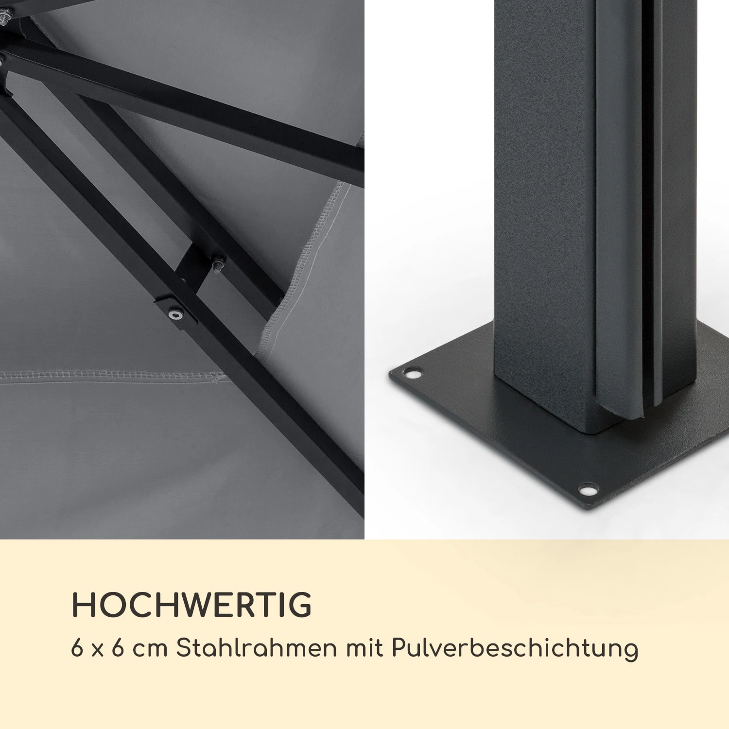 Besonders bei schräger Sonneneinstrahlung, Wind oder Regen kommen die 4 flexiblen Seitenteile zum Tragen, die je einzeln per komfortablem Auf- und Abrollmechanismus geöffnet und geschlossen werden können und aus waschbarem Polyester gefertigt sind. Beim Aufbau der Konstruktion ist es ratsam, auf eine besonders senkrechte Verankerung der Standfüße im Boden zu achten, um einen gleichmäßigen und faltenfreien Auf- und Abrollvorgang zu gewährleisten.