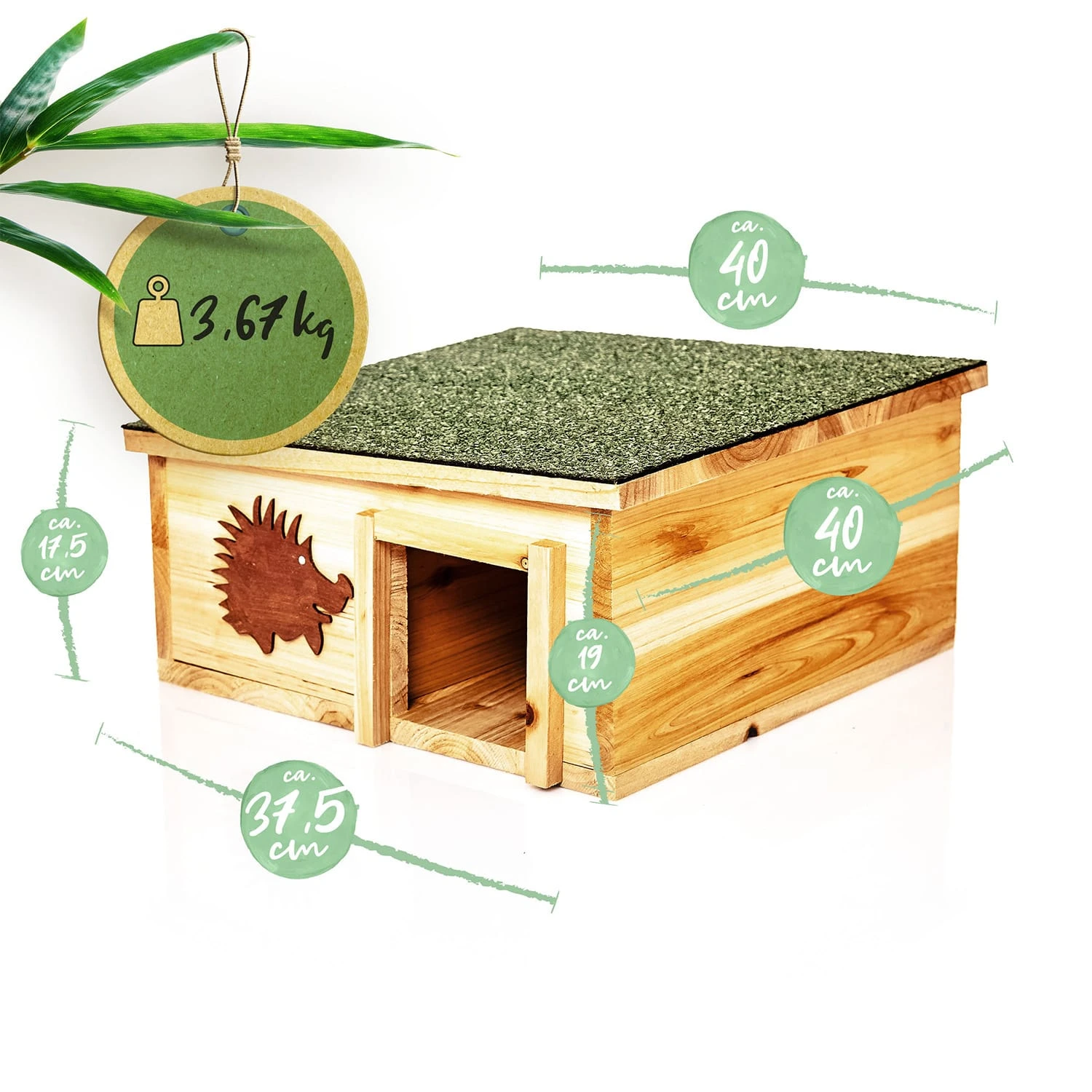 Die kompakte blumfeldt Igelpension ist aus unbehandeltem Tannenholz gefertigt und besitzt genau die richtige Größe, damit junge und ausgewachsene Tiere eine sichere und gemütliche Bleibe finden. Egal ob du den Igeln eine Möglichkeit zum Überwintern, einen geschützten Platz zum Fressen oder eine sichere Nistmöglichkeit bieten willst, das Igelhaus ist für alle diese Zwecke das ganze Jahr über geeignet. Einfach das Innere des Hauses mit etwas Laub, Stroh, Holzwolle oder ähnlichem leicht befüllen und schon wird es in kurzer Zeit einen neuen wehrhaften Bewohner anlocken. Dabei tust du nicht nur den Igeln einen Gefallen, sondern auch deinem Garten, denn die Tiere sind wahre Meister der natürlichen Schädlingskontrolle: Schnecken, Käfer und Raupen stehen ganz oben auf ihren Speiseplänen.