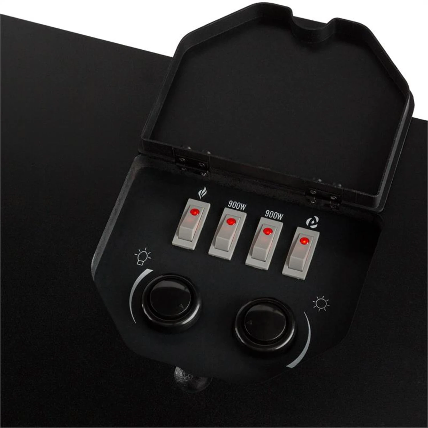 Die Flammen aus Halogen-Beleuchtung züngeln völlig unabhängig von der Heizfunktion auch in lauen Sommernächten und sorgen jederzeit für eine romantische Atmosphäre. Für angenehme Wärme sorgt auf Wunsch der zuschaltbare Heizlüfter, der bei wahlweise 1000 oder 2000 Watt Räume bis 40 m² beheizt. Die Bedienung des Elektrokamins erfolgt direkt am Kamin: Die Schalter hierfür sind dezent hinter einer Ofenklappen-Abdeckung verborgen. Mit ihnen können Flammeneffekt, Heizung und Lüftung eingeschaltet werden. Über 2 Drehregler lassen sich die Temperatur und Intensität des Flammeneffekts kontrollieren.