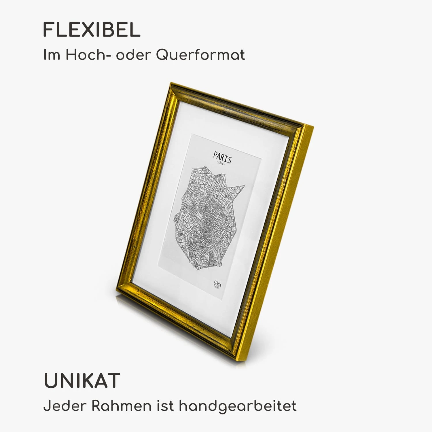 Jeder Rahmen ist ein Unikat: Der Lancaster Bilderrahmen von Casa Chic by blumfeldt aus edlem Pinienholz im Shabby-Chic-Look ist handgearbeitet und bringt deine Fotos und Bilder sowohl im Hoch- als auch im Querformat ideal zur Geltung. Bleibe flexibel und gestalte wunderschöne Wandcollagen oder arrangiere deine Lieblingsfotos auf dem Sideboard oder im Regal. Das mitgelieferte Passepartout überlässt dir die Wahl des passenden Bildausschnitts. Das gleichmäßig breite Rahmenprofil und die Frontscheibe aus Echtglas sorgen für Eleganz und besten Schutz.