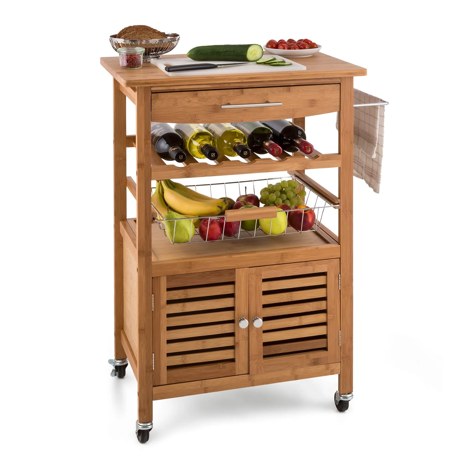 Ein Platz für alles: Auf fünf Etagen bringst du im Klarstein Louisiana Servierwagen Geschirr, Vorräte, Flaschen, Besteck und Küchengeräte gut geordnet unter. Dafür sorgen die große Arbeitsplatte, eine topseitige Schublade, ein Weinregal für bis zu vier Flaschen, eine Obstschütte und ein kleines Schränkchen. Zum Anrichten stehen dir gleich 2400 cm² auf der edlen Arbeitsplatte zur Verfügung, um fertige Speisen an den Tisch zu fahren oder dort direkt vorzubereiten. Dank Hartgummirollen gleitet der Servierwagen leichtgängig sogar über Teppichböden. So verrichtet der Küchenbutler freudig seine Dienste als Anrichte oder Beistelltisch.