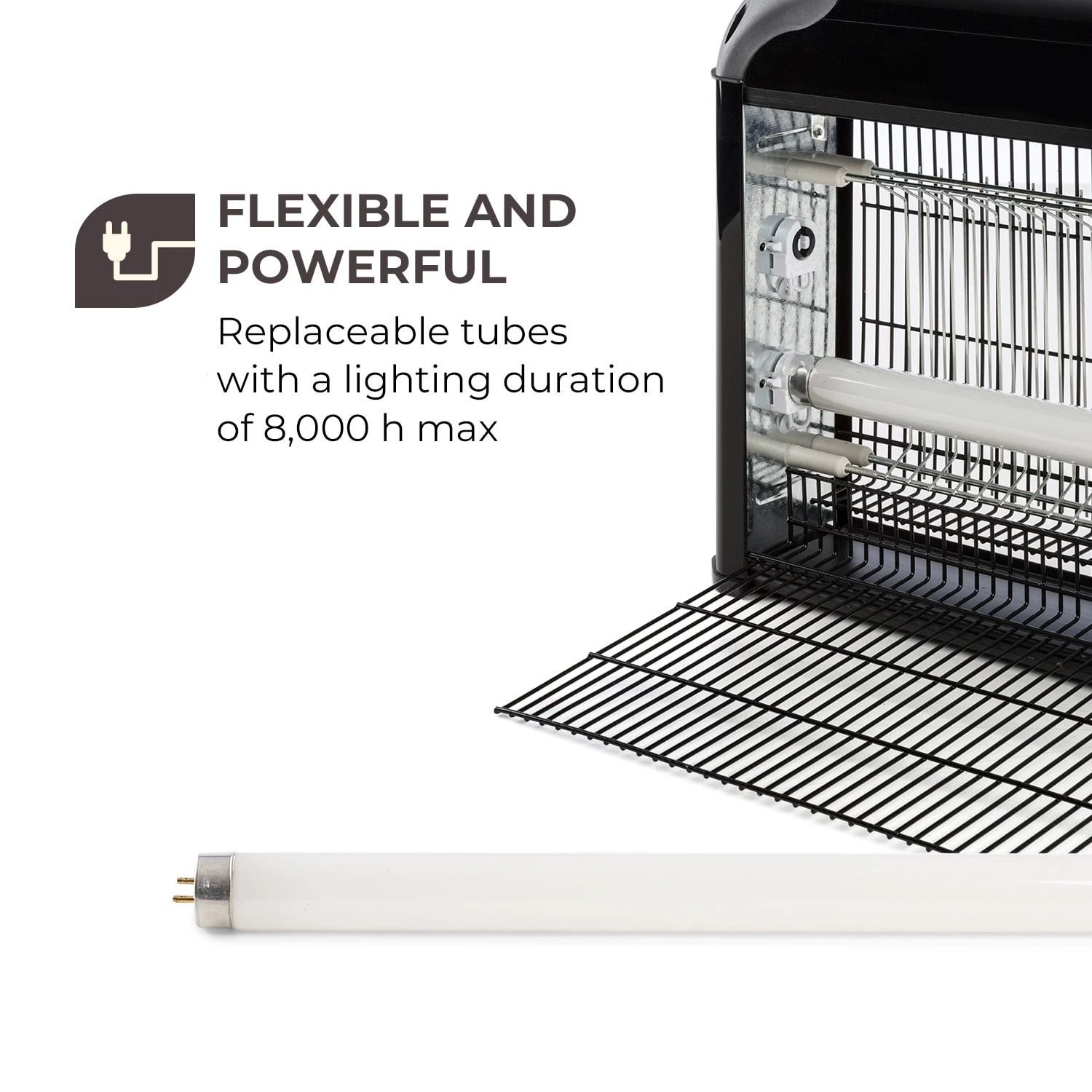 Die Mosquito Ex 5000 Insektenfalle hilft Stechmücken, Fliegen und andere lästige Plagegeister in Wohnungen, Küchen oder Ställen zu beseitigen und schafft ganz ohne Chemikalien Erleichterung. Dabei werden die Insekten von 2 UV-Röhren mit jeweils 15 Watt angelockt und durch Hochspannungsdrähte mit 2200V schnell getötet. Durch die Verwendung von Schwarzlicht funktioniert die Falle sowohl bei Tag als auch bei Nacht.