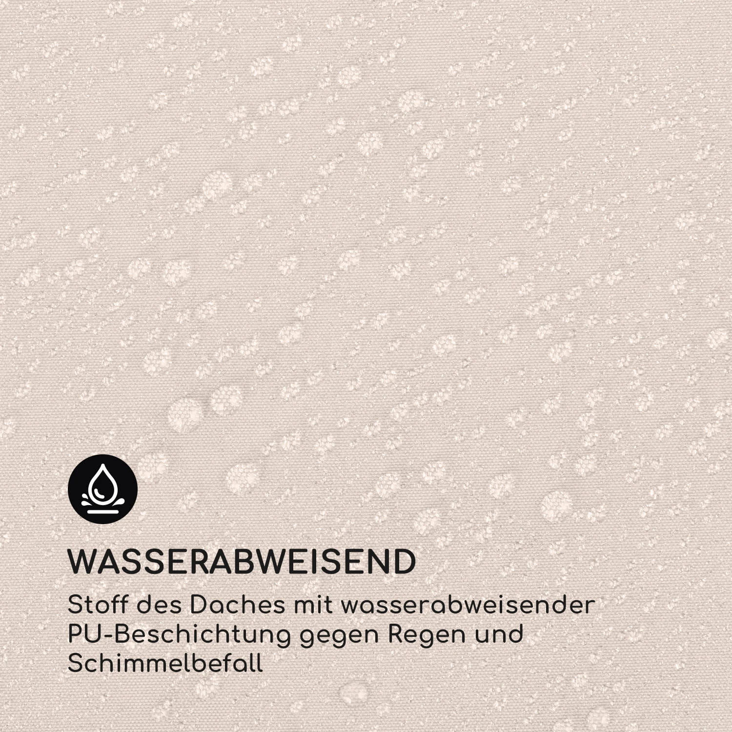 Mit dem stufenlos raffbaren Stoffdach aus 180 g/m² Polyester erhält man die volle Kontrolle über Schatten und Sonne. Der Seilzug lässt das Sonnendach des Pavillons in seinen Führungsschienen geschmeidig vor- und zurückgleiten, die wasserabweisende Beschichtung schützt vor Schimmel und kurzen Regenschauern. Durch die flexibel auf- und abrollbaren Seitenteile aus 160 g/m² Polyester-Stoff bleibt man die ganze Zeit windgeschützt.