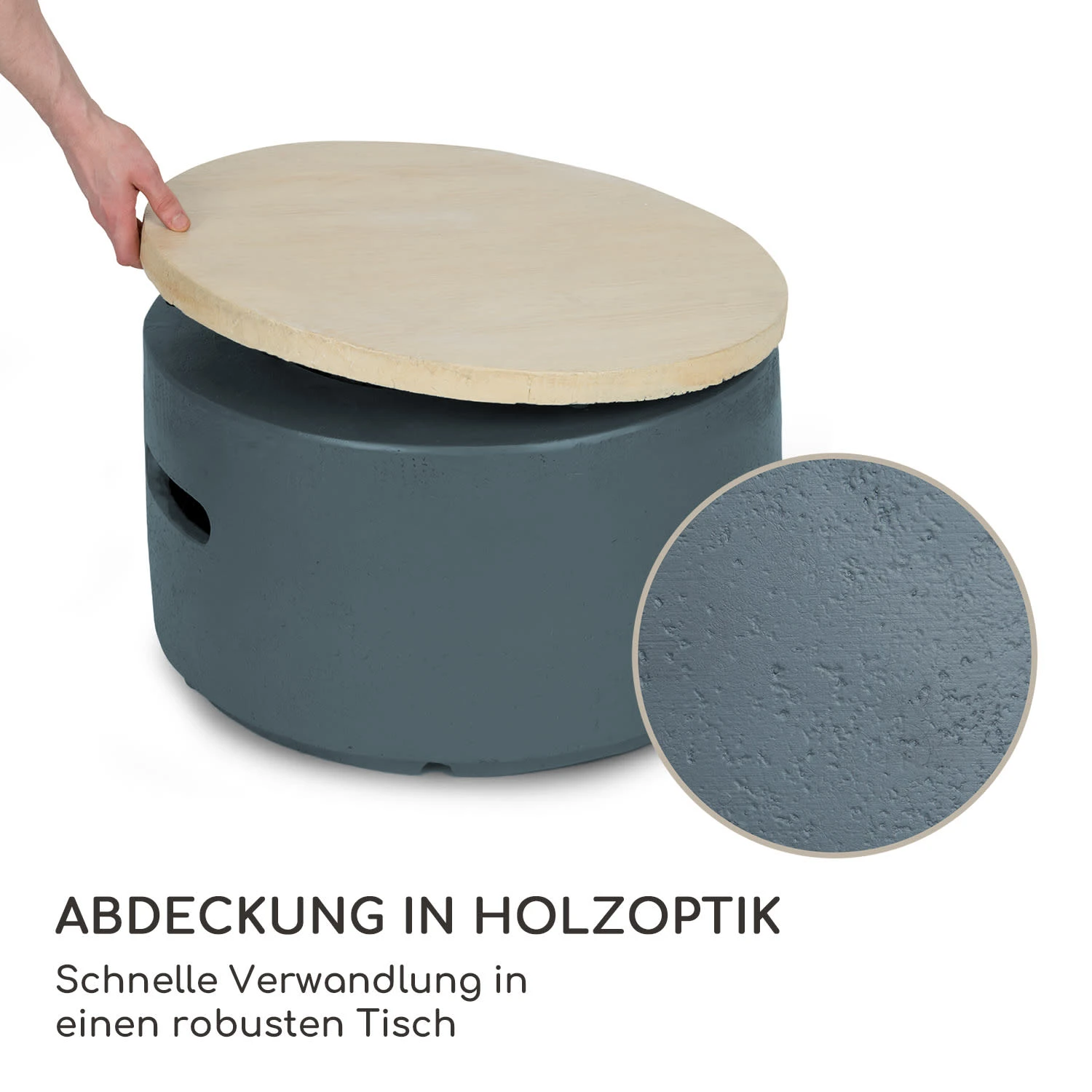 Mit der ausgefallenen blumfeldt Pilos Gas-Feuerstelle kannst du in deinem Garten eine wundervoll romantische Feuerschale installieren, welche sich im Handumdrehen in einen rustikalen Gartentisch verwandelt. Dafür bringt der robuste Gasheizer direkt einen passenden, unempfindlichen Deckel in Holzoptik mit. Nimmst du den exakt passenden, runden Deckel ab – dann zeigt sich eine Feuerstelle, in welcher wärmende Flammen aus natürlichen Lavasteinen züngeln.
