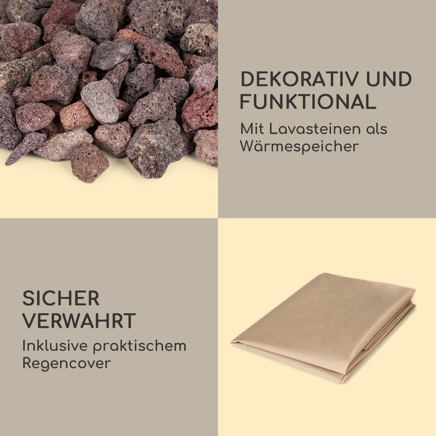 Die blumfeldt Prati Freiluftheizung erzeugt bis zu 13 kW Heizleistung und versorgt dich und deine Gäste schnell und effektiv mit angenehm wohliger Wärme. Im Mittelpunkt steht natürlich die fulminante Flamme, die unkompliziert über das integrierte elektrische Zündsystem entfacht wird. Mit einem leichtgängigen Regler sowie dem mitgelieferten Schlauch mit Druckminderer wird die Gas-Zufuhr aus Propan- oder Butan-Gasflaschen reguliert, die du ganz einfach im geräumigen Innenraum verstaust. Umrandet wird die Gasflamme von einer stilechten Lavasteindekoration, die für ein beeindruckendes und ungefährliches Schauspiel sorgt. So ausgerüstet erweitert die Prati Gas-Feuerstelle die Freiluftsaison um ein paar weitere Monate mit behaglicher Wärme.
