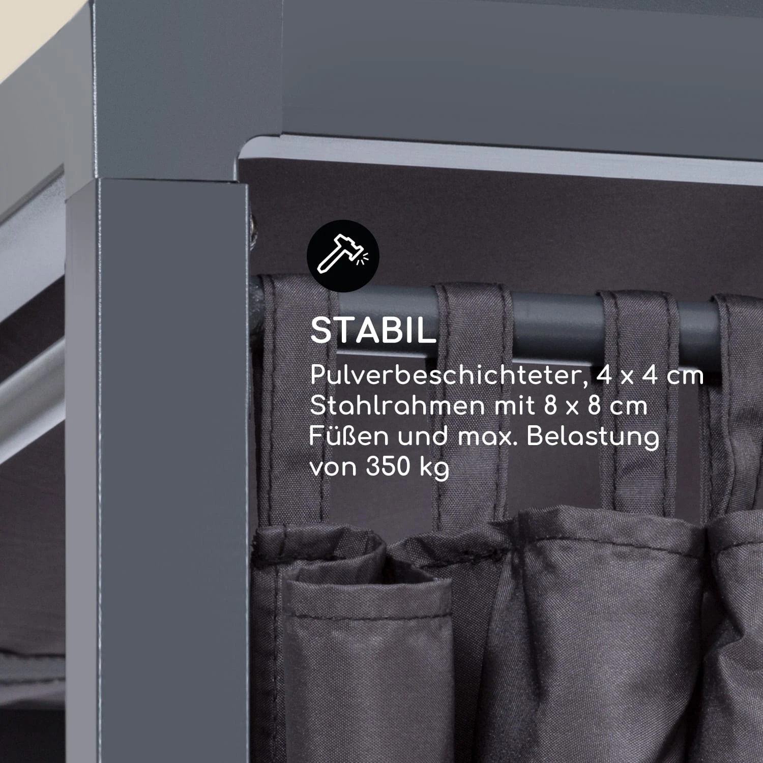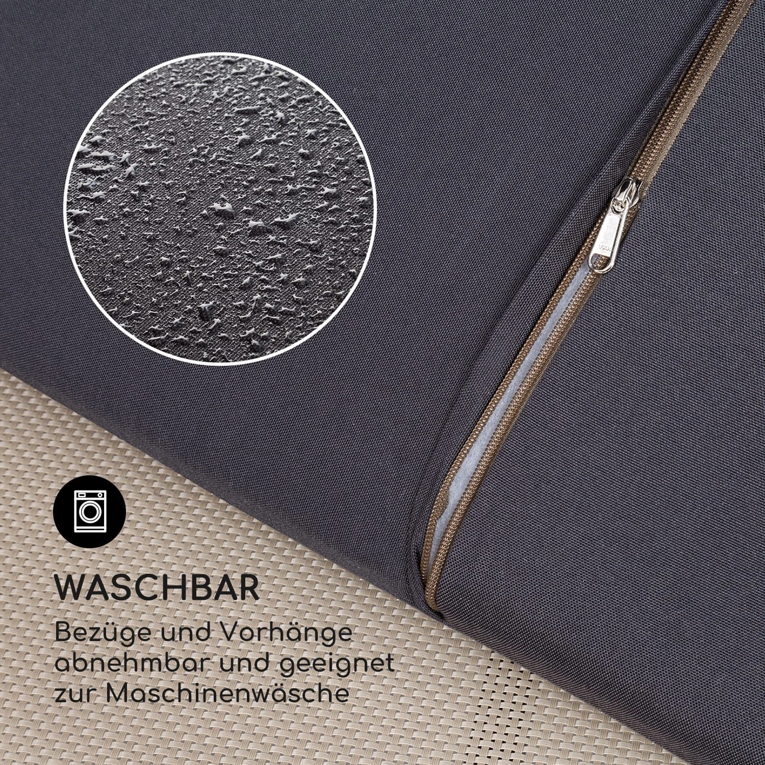 Stabil und praktisch sind die Ansprüche von Blumfeldt an die Senator Lounge Gartenliege. Entsprechend ist der 4 x 4 cm Stahlrahmen witterungsfest pulverbeschichtet und mit großen 8 x 8 cm Standfüßen ausgestattet. Das sorgt für eine maximale Gewichtsbelastung von 350 kg. Die Vorhänge sowie die Bezüge der beiden miteinander verbundenen Matratzen sind abnehmbar und können ganz einfach in der Maschine gewaschen werden. So bleibt der Pavillon lange schick und himmlisch entspannend.