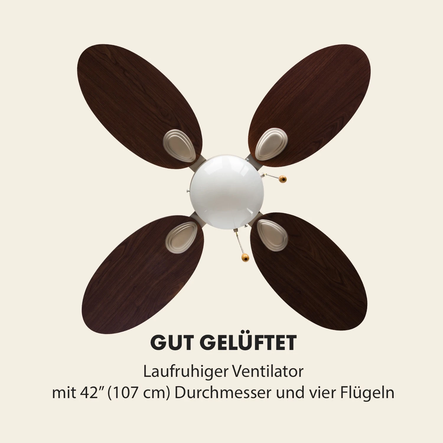 Mit dem Klarstein Valderama 2-in-1 Deckenventilator funktioniert die Luftumwälzung von oben nach unten einfach und angenehm. Damit hält nicht nur im Schlafzimmer frischer Wind Einzug. Mit vier Flügeln in Kirschholz-Optik fächert der 42″ Ventilator in drei Geschwindigkeiten frische Luft zu und erschafft mit seinem leisen, rhythmischen Arbeitsgeräusch von weniger als 55 dB auf höchster Stufe eine entspannend-beruhigende Atmosphäre. Seine beiden Drehrichtungen ermöglichen den Einsatz an warmen und kalten Tagen: Im Rechtslauf drückt er unter der Decke hängende, warme Luft in den Raum und hilft so im Winter Heizkosten zu sparen. Der Linkslauf erzeugt er hingegen einen nach oben gerichteten, erfrischenden Luftstrom, der die körpereigene Temperaturregulierung an warmen Sommertagen kräftig mit einer Luftumwälzung von bis zu 7.480 m³ in der Stunde unterstützt. Als besonders praktische 2-in-1 Kombination verfügt er außerdem über eine integrierte, zweiflammige Deckenleuchte. Die spendet Licht in dunklen Stunden und ist durch ihren Milchglasschirm besonders stilvoll. Die Installation erfolgt besonders platzsparend direkt an einem vorhandenen Lampenanschluss an der Zimmerdecke.